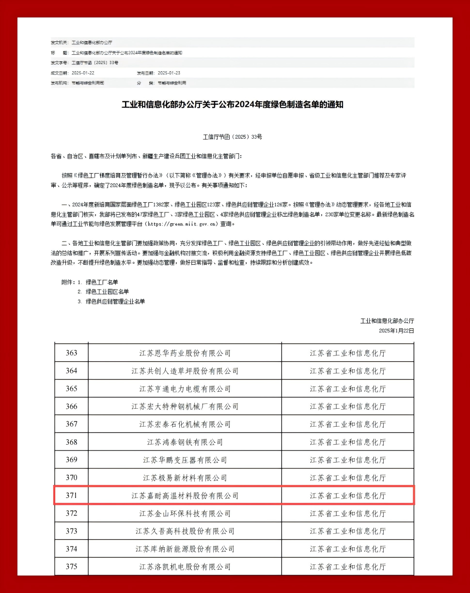 喜報!嘉耐股份榮獲國家級綠色工廠