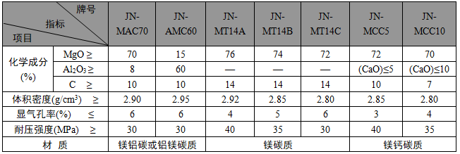 ·JN系列低碳磚、無(wú)碳磚主要理化指標(biāo)·